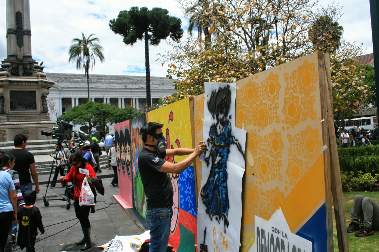 When we got to the plaza y 10:30, there was a huge crowd already with the streets lined with news and media trucks, cameras and reporters everywhere! Seems a huge political rally was going on in support of President Correa because he wanted to show that regardless of his decision to drill for oil in the Amazon, he had the support of the people.