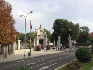 The day couldn't have been more gorgeous, so we continued on up the hill and entered a huge park called Parque del Retiro Jeronimo. With a small map, we found our way to the Crystal Palace, which sat next to a beautiful large pond with waterfall. The Palace was empty except for a small art exhibit. However, it was originally built to house plants from the Philippines. https://en.wikipedia.org/wiki/Palacio_de_Cristal
